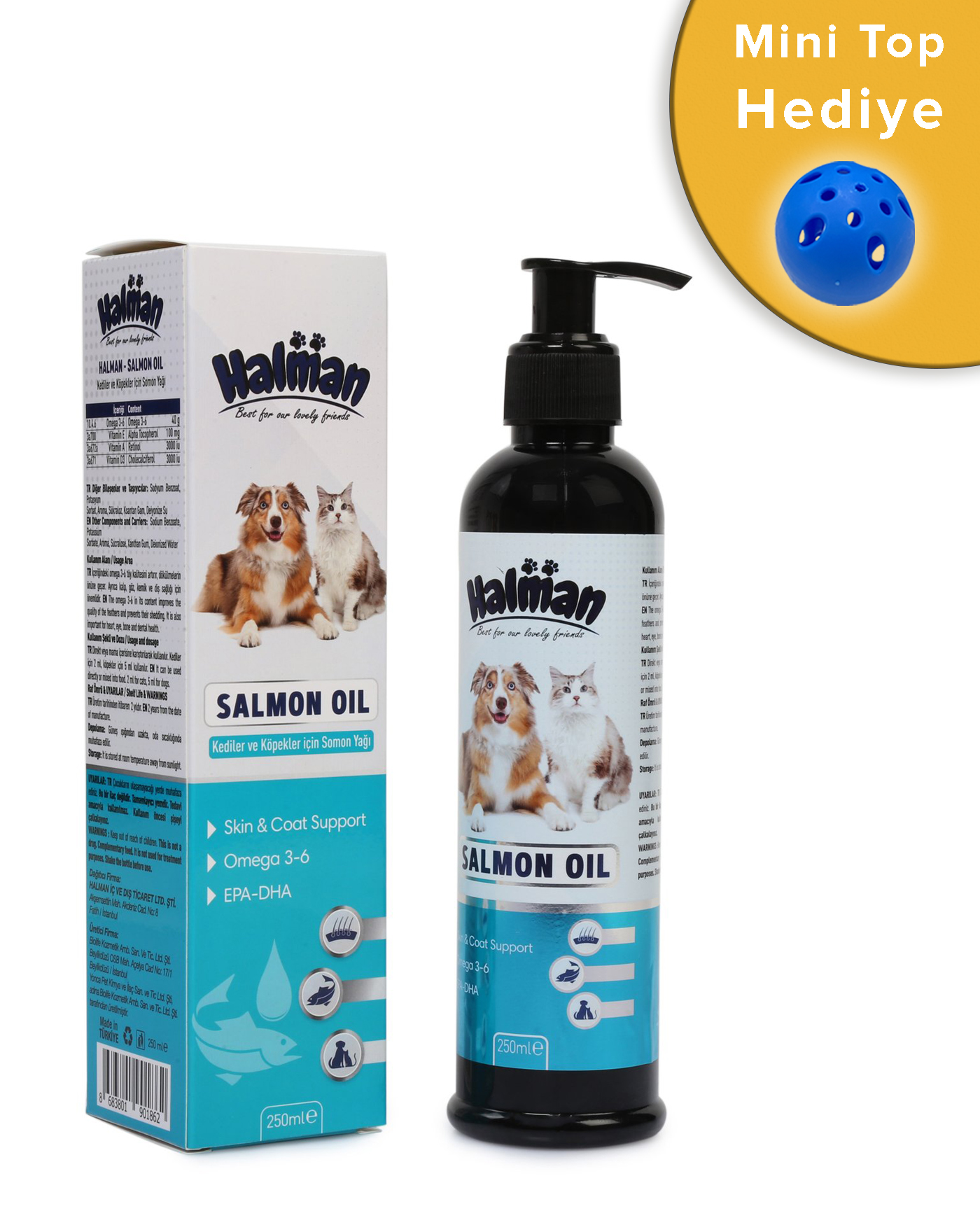 Halman Salmon Oil Köpekler İçin Balık Yağı içeriğindeki Omega 3-6 tüy kalitesini artırır,dökülmelerin önüne geçer.Ayrıca kalp,göz,kemik ve diş sağlığı için önemlidir. Direkt veya mama içerisine karıştırılarak kullanılır. Köpekler için 5ml kullanılır.
